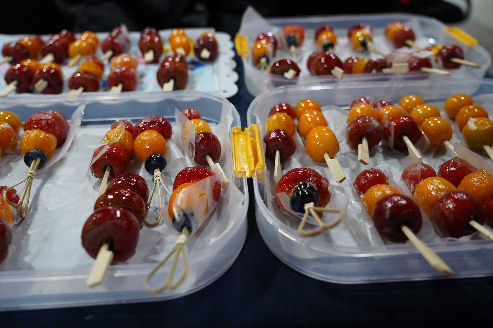 在美食集市區,大家現場體驗制作童年記憶--糖畫、冰糖葫蘆。鐵勺是筆,糖稀是墨,糖熬成的糖稀吐出甜蜜的小泡泡,輕輕一勺,各種栩栩如生的圖形,躍然而成。一支支的冰糖葫蘆,不僅串起了職工之間的甜蜜互動,也勾起了這些“大朋友”們對美好童年的回憶。