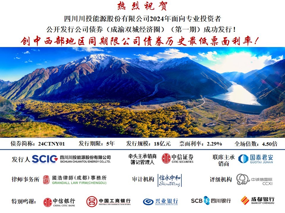 7月10日,川投能源2024年面向?qū)I(yè)投資者公開發(fā)行公司債券(成渝雙城經(jīng)濟(jì)圈)(第一期)成功發(fā)行。本期公司債券發(fā)行規(guī)模18億元,期限5年,票面利率2.29%,創(chuàng)中西部地區(qū)同期限公司債券歷史最低發(fā)行票面利率。