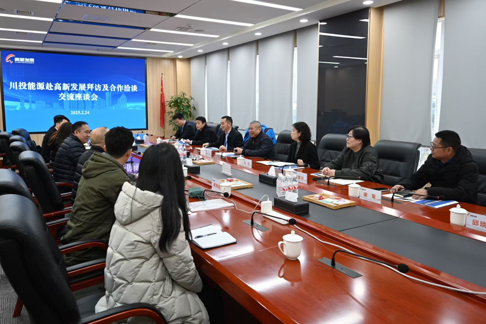 2月24日,川投能源黨委書記、副董事長、總經理楊洪率隊拜訪成都高新發展股份有限公司,雙方就深化合作進行座談交流。高新發展黨委書記、董事、總經理馮東主持座談。