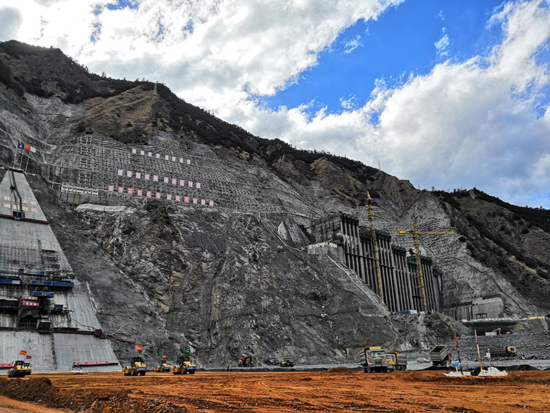 目前,正值兩河口電站工程建設的重要時期,到處都是熱火朝天的勞動畫面。上百家參建單位、2萬多名建設者揮灑“艱苦不怕吃苦、缺氧不缺精神”的豪邁情懷,克服“五高六大兩長”難點和高寒海拔惡劣自然環境、復雜的建設環境等不利條件,工程建設實現一個又一個里程碑目標。在高土石壩,上百臺推土機在工地上忙碌穿梭,建設者們忙碌的身影和機械的隆隆聲交織回蕩在高山峽谷中,這座世界第3高壩正日益成型;在兩岸巖壁上,為了在200層樓高的幾乎垂直的巖壁中固定15000根錨索,黨員帶頭沖鋒在前,硬是將一根根的錨索肩扛手提抬了上去;在地下廠房,建設者們克服潮濕昏暗、溫差變化大的不利條件,晝夜不停精心安裝碩大無比的發電裝置,工地上隨處可見一面面黨員突擊隊、青年突擊隊火紅的旗幟迎風飄揚,成為一道道亮麗的風景線。