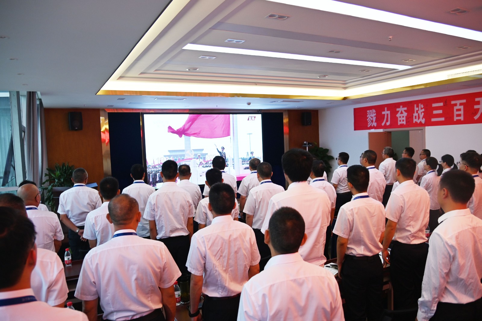 視頻中,習近平總書記鏗鏘有力的聲音深入人心,從1921到2021,中國共產黨帶領中國人民,從風雨飄搖中一路走來,百年征程波瀾壯闊,百年初心歷久彌堅。當《國歌》《國際歌》相繼響起的時刻,會場人員紛紛起立,跟隨激昂的旋律整齊高唱。當回顧“四史”贊頌黨的偉業之時,會場人員滿溢出對黨的感恩和身為黨員的自豪。