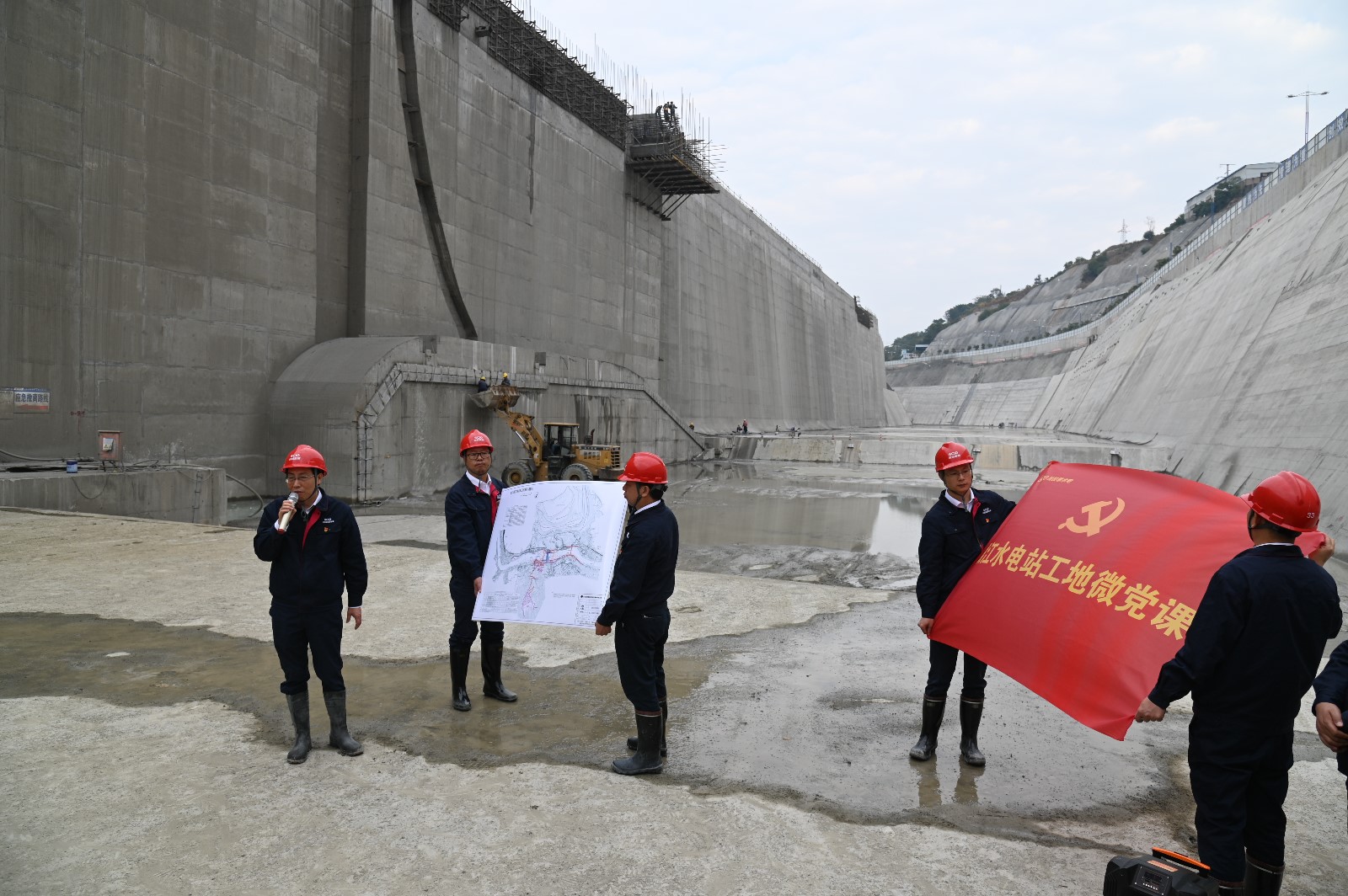 在導流明渠基坑里,徐孝剛書記為大家講授了一堂別開生面的工地微黨課。他講到,今天站在已澆筑完成的導流明渠基坑,大家都應倍感自豪,今天也是最后一次在導流明渠基坑里開展微黨課。再過兩天,我們的導流明渠就要過流了,回顧導流明渠施工的一年多時間里,我們克服了新冠疫情影響、征地拆遷滯后、邊坡地質條件差、砂石骨料短缺等重重困難,今天的成果來之不易,靠的是全體參建單位、全體員工的共同努力,今天在這里要再向大家道一聲感謝,正是你們的艱苦付出和無私奉獻,才取得了我們今天的驕人成績。徐孝剛還對照圖紙和現場的施工實體,再次向大家普及了縱向圍堰、消力池、正常蓄水位、死水位等水電站施工的基礎知識,向大家講解了銀江水電站巖埂拆除、大江截流、檢修閘門和三期擋水發(fā)電等重點知識。徐孝剛強調,按期保質保量推進工程進度是我們的“初心”,把銀江水電站建設成為“精品工程、樣板工程、陽光工程”是我們的“使命”。在這最關鍵的時期,大家要再接再厲,保持緊張有序,做到萬全準備,嚴把各個關口,確保導流明渠過流和大江截流的按期順利實現,用最優(yōu)異的成績?yōu)?021年畫上圓滿句號,為建黨百年獻上銀江賀禮。