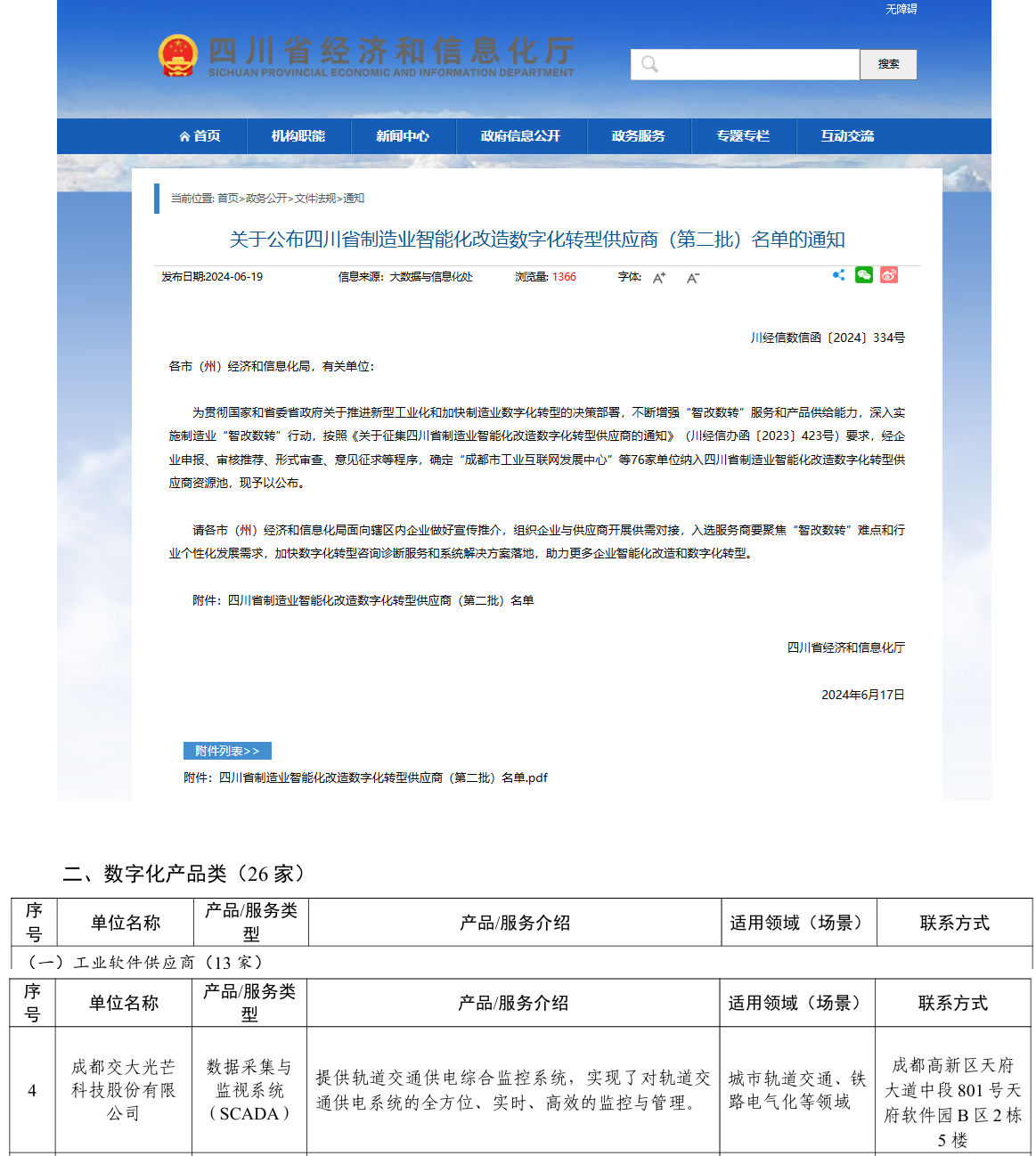2024年6月19日,四川省經(jīng)濟和信息化廳網(wǎng)站公布四川省制造業(yè)智能化改造數(shù)字化轉型供應商(第二批)名單,交大光芒作為數(shù)字化產品類工業(yè)軟件供應商入選四川省制造業(yè)智能化改造數(shù)字化轉型供應商資源池。