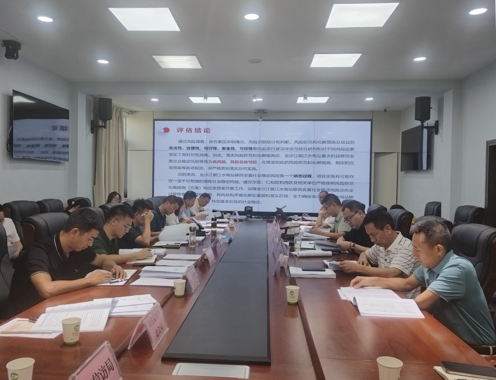 會議首先由設計單位對銀江水電站工程蓄水階段移民安置社會穩定風險評估報告成果進行匯報,與會人員進行了充分討論,在社會穩定風險識別、風險防范和化解措施等方面提出了修改意見及建議。會議認為,該報告內容符合實際情況,達到《四川省社會穩定風險評估辦法》要求,金沙江銀江水電站工程蓄水階段移民安置社會穩定風險等級為低風險,風險總體可控。會議要求相關部門要持續抓好風險防范工作及化解措施的執行,確保不發生水利水電工程移民群體事件,為下一步銀江水電站工程蓄水移民安置驗收打牢基礎。
