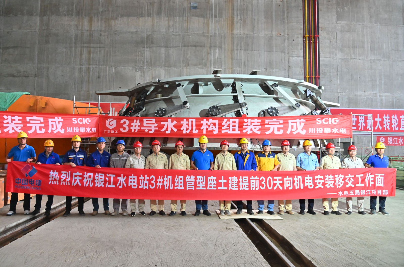 ?三期澆筑提速破局,機組拼裝全力推進。公司緊緊圍繞2025年防洪度汛和全部機組投產發電這兩個重點目標,團結帶領各參建單位,精心統籌、倒排工期,采取優化設計方案、調整施工工藝、強化資源調配等一系列措施,推動工程建設始終保持高速前進的態勢。目前,銀江水電站三期工程11號至13號壩段混凝土澆筑施工全面推進,一季度實際完成的澆筑工程量超出原計劃20%;3號機組轉子組裝工作已經完成,定子組裝完成60%,導水機構、主軸等關鍵部件均已運抵現場并正在加緊組裝;3號機組管形座二期混凝土澆筑完成 50%;5號、6號機組管形座安裝分別完成90%、60%,正朝著2025年底全面建成投產的目標全力奮進。