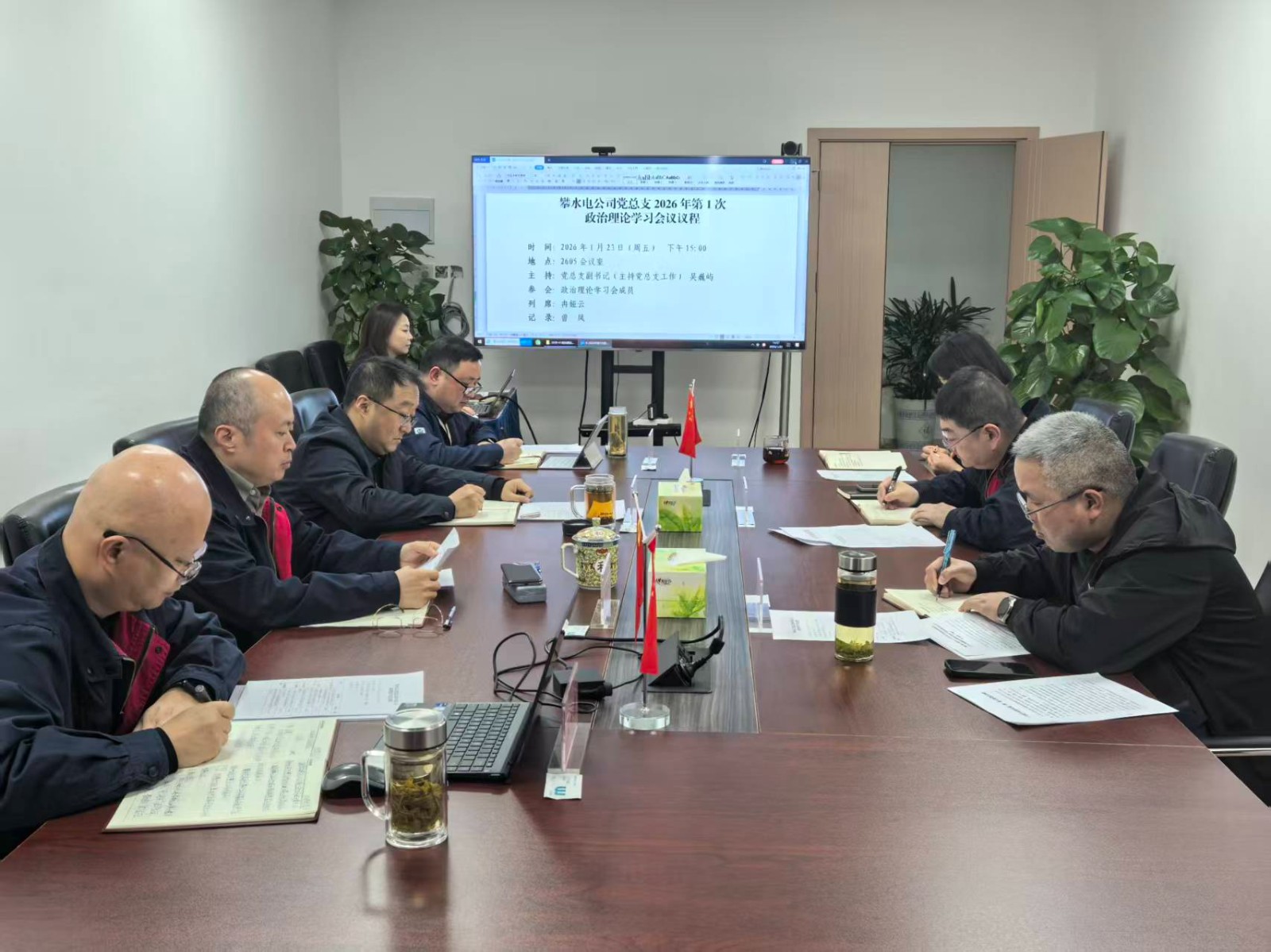 1月23日,攀水電公司黨總支組織召開了2026年第1次政治理論學習會,黨總支副書記、總經理吳巍嶼主持會議并帶頭研討發言,黨總支政治理論學習會成員參加。